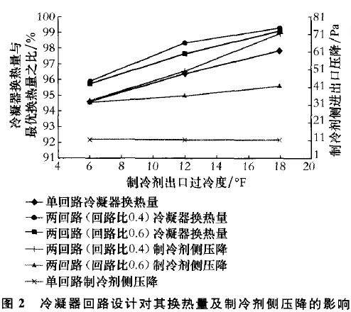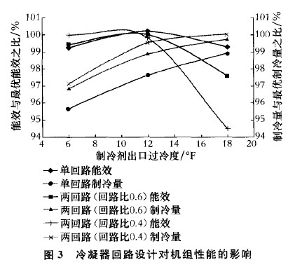模擬結(jié)果表明,該機(jī)組冷凝器的較優(yōu)設(shè)計(jì)方案為回路比為0.4的兩回路,過冷度優(yōu)化在10~ 12。F。以上各種回路的設(shè)計(jì)方案對(duì)系統(tǒng)的制冷量及能效的影響在2 -5 范圍內(nèi)。